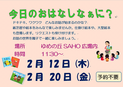 2月は一年で最も寒さが厳しい時期ですが、暦の上では「立春」を迎え春の兆しが少しずつ見られる月でもあります。 子育て広場「ゆめの丘SAHO」は3月31日で閉所いたします。 残り2ヶ月となりましたが、皆さんとの出会いに感謝し、楽しく過ごせたらと思っています。